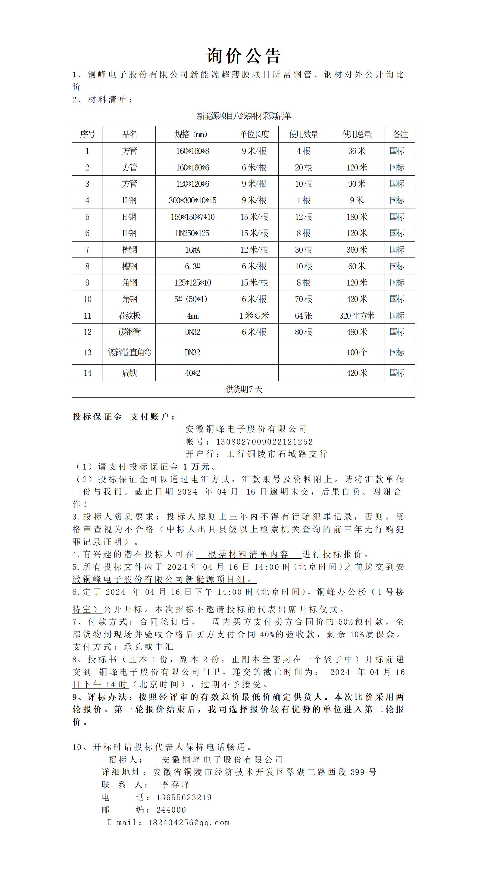 銅峰電子股份有限公司新項目八線鋼材詢價公告