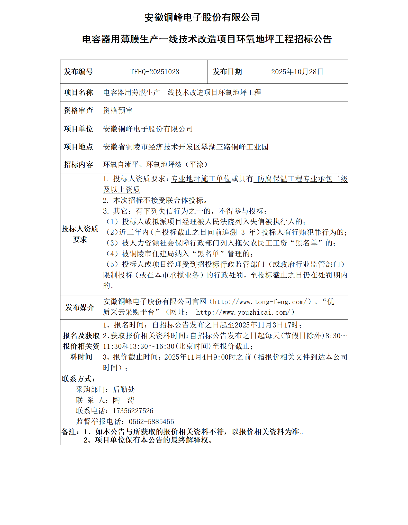 安徽銅峰電子股份有限公司 (電容器用薄膜生產(chǎn)一線技術(shù)改造項目環(huán)氧地坪工程 招標公告)_01
