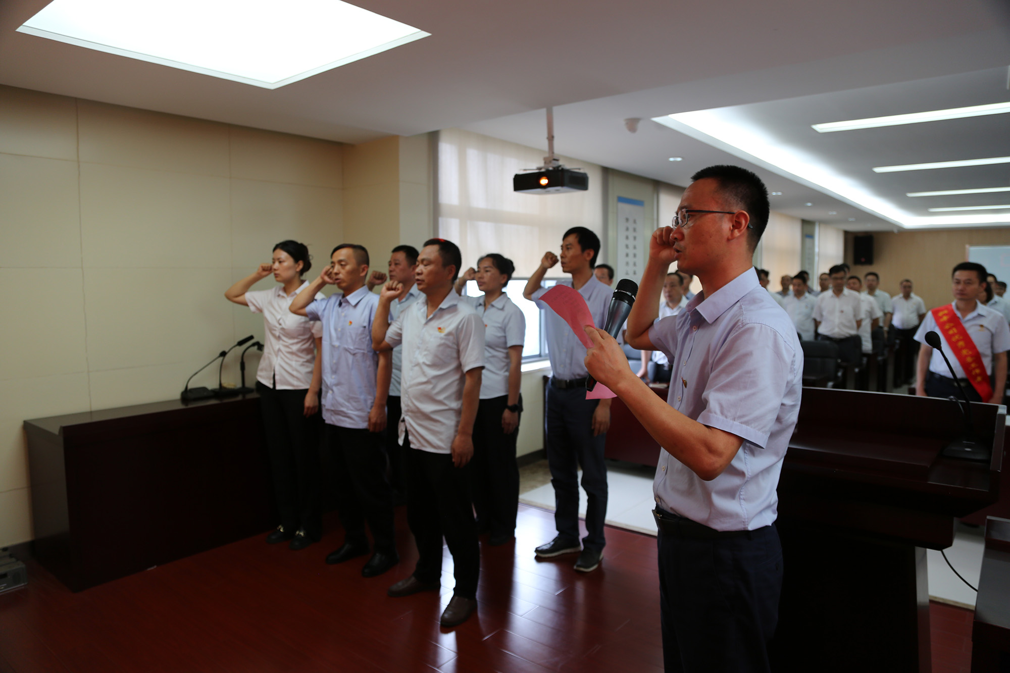 在首先進(jìn)行的新黨員入黨宣誓儀式上,黨委委員林政宣布新黨員名單,歡迎新黨員加入黨組織并向他們提出希望和要求。隨后,由黨委委員何曉明領(lǐng)誓,新黨員進(jìn)行入黨宣誓。在“兩優(yōu)一先”表彰環(huán)節(jié),公司黨委領(lǐng)導(dǎo)為受表彰對象頒發(fā)榮譽(yù)證書,“兩優(yōu)一先”代表分別作先進(jìn)事跡報(bào)告。